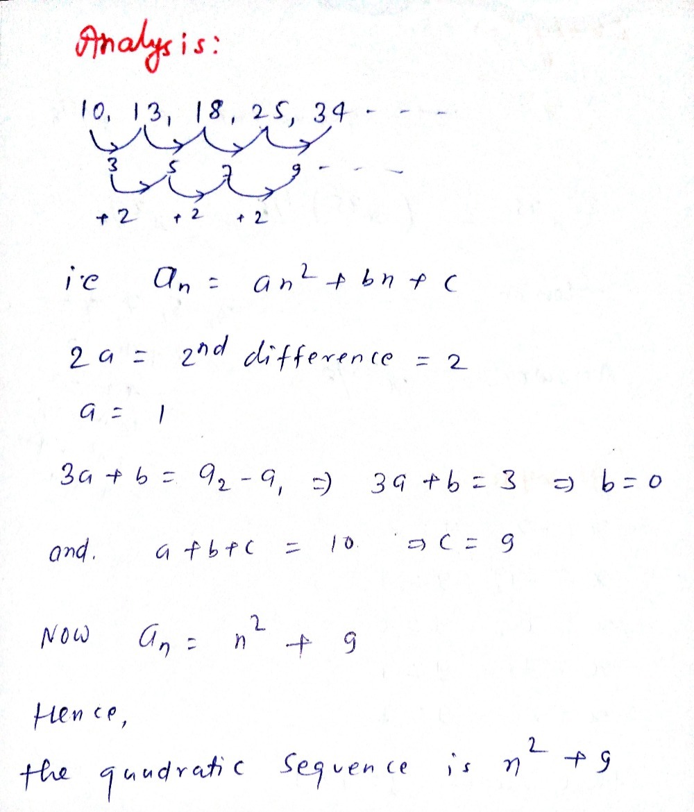 Finding The Nth Term Of A Quadratic Sequence Minimally Different from minimallydifferent.files.wordpress.com The second difference is equal to 2a. This sequence has a constant difference between consecutive terms. Any sequence that has a common second difference is a quadratic sequence. What is second difference in math? In other words, a linear sequence results from taking the first differences of a quadratic sequence. F (x) = ax^2 + bx + c where a, b, and c are constants. Get b by plugging in one of the terms from the sequence. 6, 11, 18, 27, 38, 51 … has formula: